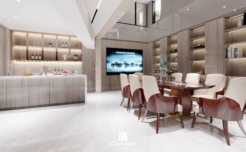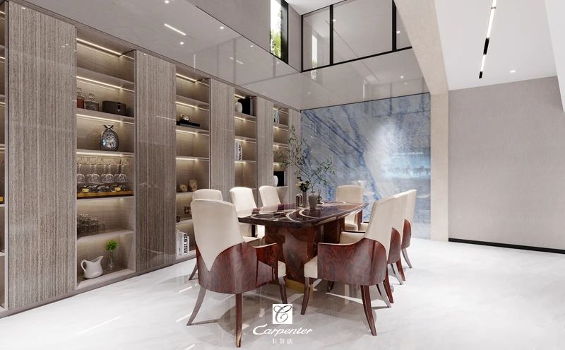 餐廳的一面以酒柜呈現(xiàn)
