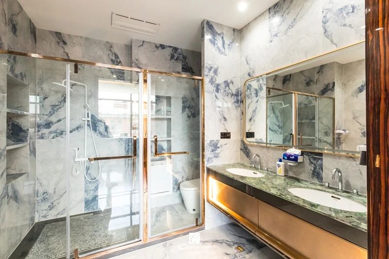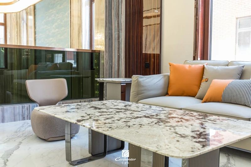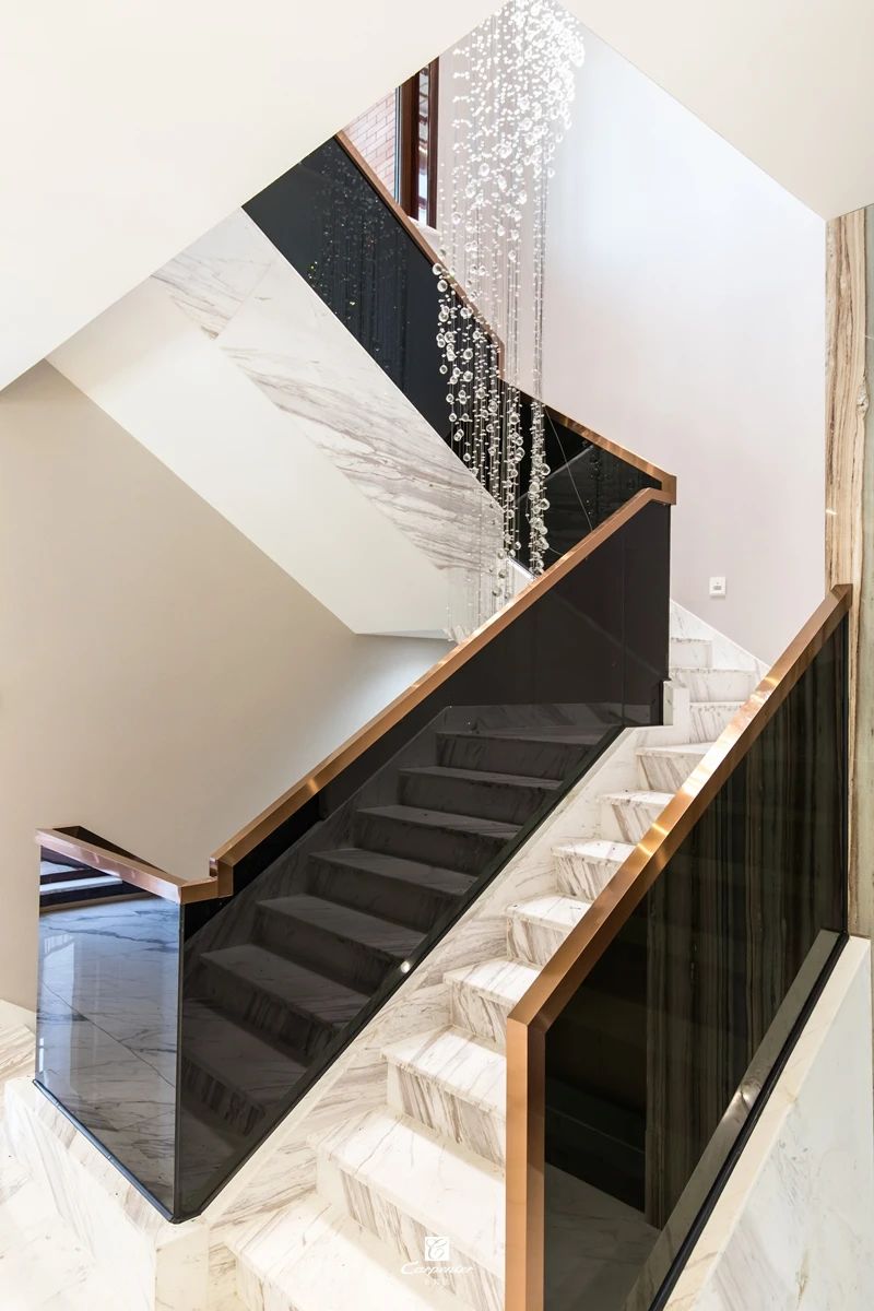 與大理石肌理、金屬扶手的融入