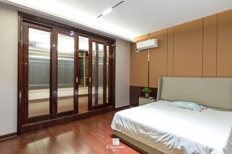 過(guò)道空間與臥室門選用黑檀木皮木飾面