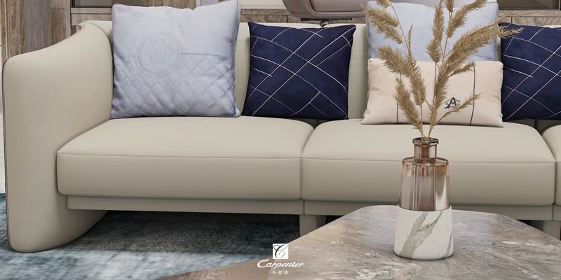 杏子灰色真皮沙發,一字型金屬拉扣設計